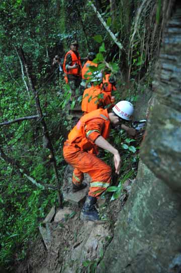 7月12日上午,重慶市搜救官兵從潭獐峽河谷左岸一處懸崖邊經(jīng)過(guò)。