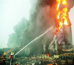 7月15日中午,消防隊(duì)員在河南偃師化工廠爆炸現(xiàn)場(chǎng)進(jìn)行搶險(xiǎn)救援。當(dāng)日凌晨2時(shí)許,河南偃師市洛染股份有限公司發(fā)生爆炸并起火燃燒,百余人不同程度受傷,目前已知有5人死亡,2人下落不明。明火已被撲滅。現(xiàn)場(chǎng)周邊千米以內(nèi)的居民和可能受影響的群眾都被疏散。