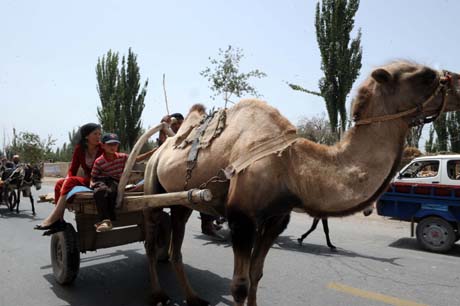 在新疆喀什的鄉(xiāng)村和城郊活躍著許多馬車、毛驢車、駱駝車等交通工具,不但方便了城鄉(xiāng)居民的出行,也成為古城喀什的一道別樣風(fēng)景線。圖為坐著駱駝車走在喀什市浩罕鄉(xiāng)馬路上的一家人。