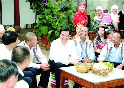 圖為胡錦濤在楚雄市蒼嶺鎮(zhèn)馬石鋪村彝族村民李鳳祥家小院中,同回族、彝族群眾坐在一起拉家常,希望各族群眾和睦相處、互幫互助,共同實現(xiàn)致富奔小康目標。