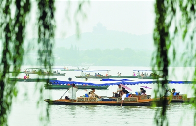8月2日,游客在泛舟西湖。 當(dāng)天,杭州的最低氣溫在25℃左右,大批游客前來享受八月西湖難得的清涼。從7月24日開始,曾經(jīng)“火爐”似的杭城一下子變得涼爽,27.9℃的平均氣溫更是創(chuàng)了38年來同期新低。