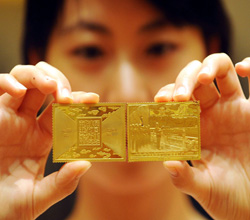 8月10日拍攝的《開國大典》郵票金磚。當(dāng)天,中鈔國鼎投資有限公司和中國集郵總公司發(fā)行的中國首款郵票金磚———紀(jì)念中華人民共和國成立六十周年《開國大典》郵票金磚在京上市。該產(chǎn)品采用純金鑄造,每枚重60克,全國限量發(fā)行6000枚,并配有收藏證書和唯一編號。新華社發(fā)
