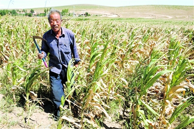 8月20日,內蒙古赤峰市巴林右旗查干淖爾鎮(zhèn)61歲的農民聶國全在自家的玉米地里“收割”旱枯的秸稈。