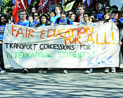 9月2日,在澳大利亞悉尼,留學(xué)生們舉行游行示威,要求公平待遇和安全環(huán)境。這次游行是由澳大利亞全國(guó)學(xué)生聯(lián)合會(huì)、澳中青年交流促進(jìn)會(huì)和印度留學(xué)生聯(lián)合會(huì)等發(fā)起的。澳大利亞目前有外國(guó)留學(xué)生共計(jì)46萬(wàn)人,海外教育產(chǎn)業(yè)已經(jīng)成為澳大利亞第三大創(chuàng)匯產(chǎn)業(yè),每年為澳大利亞帶來(lái)155億澳元的收入,然而私立學(xué)校管理混亂、教學(xué)質(zhì)量較差、學(xué)生打工遭受剝削、安全得不到保障以及移民法隨意更改等問(wèn)題引起留學(xué)生普遍不滿。新華社/法新 |