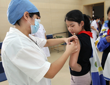 9月16日,醫(yī)務(wù)人員為北京市東城區(qū)和平里第九小學(xué)學(xué)生接種流感疫苗。 據(jù)悉,北京市60周歲以上老人和在校中小學(xué)生免費(fèi)接種流感疫苗工作已全面展開,此次疫苗接種惠及人數(shù)為180萬。