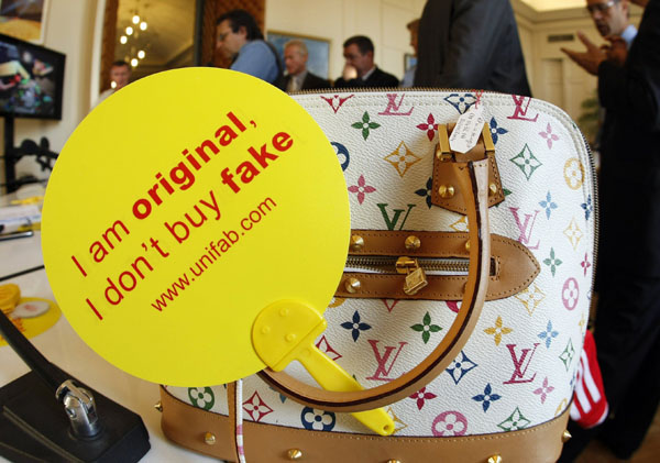 28日,在法國東南部城市戛納舉行的一個(gè)打擊假冒產(chǎn)品宣傳活動(dòng)中,仿冒名牌女包旁陳列著寫有反假冒產(chǎn)品標(biāo)語的標(biāo)牌。當(dāng)天,這里的海關(guān)人員在打假活動(dòng)中銷毀了今年夏天繳獲的2萬多件仿冒產(chǎn)品。