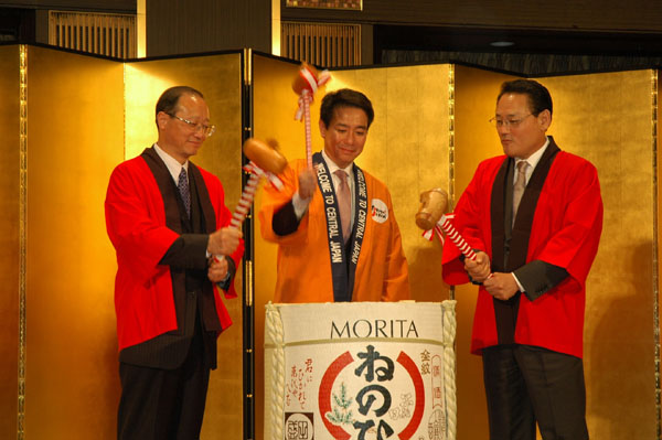 17日,在日本名古屋,中國國家旅游局局長邵琪偉(左)、日本國土交通大臣前原誠司(中)和韓國文化體育觀光部長官柳仁村(右)以敲開酒桶的方式啟動第四屆中日韓旅游部長會議。第四屆中國、日本、韓國旅游部長會議17日晚在日本名古屋開幕。中日韓三國旅游部門領(lǐng)導(dǎo)人表示,將進一步加強三國旅游合作,攜手共進,應(yīng)對危機。
