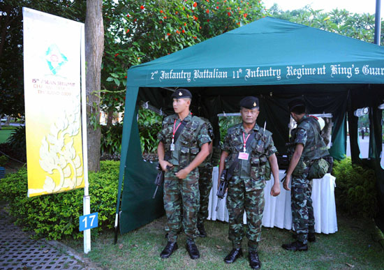 20日,士兵在位于泰國(guó)中部城市華欣的第15屆東盟峰會(huì)會(huì)場(chǎng)執(zhí)勤。第15屆東南亞國(guó)家聯(lián)盟(東盟)峰會(huì)以及東盟與對(duì)話國(guó)系列峰會(huì)將于本月21日至25日在泰國(guó)中部相鄰海濱城市差安和華欣召開。泰國(guó)部署大量安全人員以確保峰會(huì)順利召開。