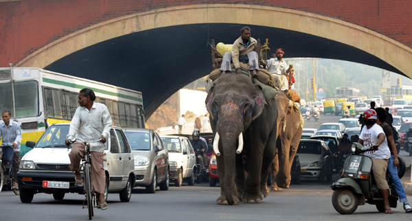 29日,在印度首都新德里,大象與汽車、摩托車、自行車一同在馬路上行進。在印度街頭有一種奇特的景觀,人們經(jīng)常能看見大象招搖過市,參加婚禮等慶典活動。新華社/法新