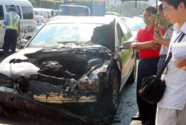 10月30日,一輛寶馬汽車(chē)在?诮诸^正常行駛時(shí),突然自燃起火,消防等部門(mén)趕到將火撲滅時(shí),車(chē)頭已燒毀,直到交警部門(mén)將車(chē)拖走,受阻近2個(gè)小時(shí)的交通才得以順暢。據(jù)車(chē)主稱(chēng),寶馬車(chē)未購(gòu)買(mǎi)自燃保險(xiǎn),自燃事故中無(wú)人員傷亡。新華社發(fā)