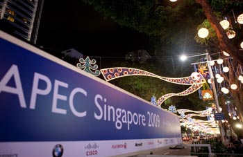 11月7日,在新加坡著名商業(yè)街烏節(jié)路,圣誕燈光璀璨,亞太經(jīng)合組織(APEC)宣傳海報懸掛在路邊。為迎接亞太經(jīng)合組織系列會議,烏節(jié)路的圣誕亮燈儀式今年提前舉行,以便讓與會來賓能夠感受新加坡獨特的“熱帶圣誕節(jié)”氣氛。新華社記者