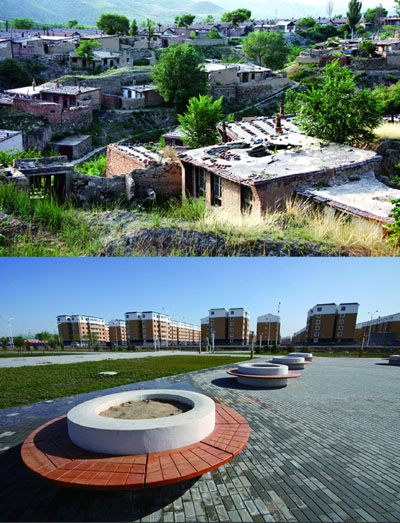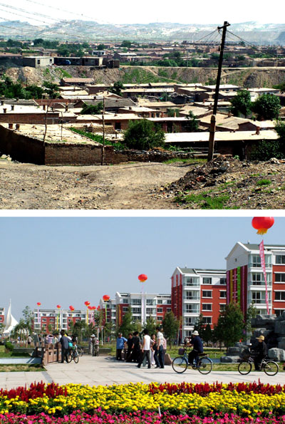 這是神華寧煤集團金能公司沉陷區(qū)老住宅原貌(上圖,資料照片)和金能公司礦工新居(下圖,2009年10月攝)對比。 |