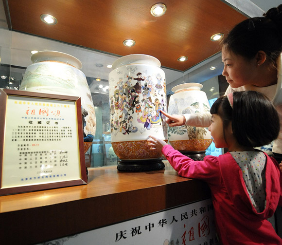圖為觀眾在北京王府井陶瓷城參觀由四位中國工藝美術(shù)大師創(chuàng)作的紀(jì)念瓷《祖國頌》。