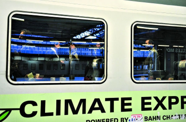 12月5日,在比利時(shí)布魯塞爾火車站,“氣候快車”準(zhǔn)備出發(fā)。這列“氣候快車”當(dāng)天從這里出發(fā),途中?康聡(guó)科隆和漢堡,最終抵達(dá)丹麥的哥本哈根。這列藍(lán)色和綠色涂裝的火車上載有400多人,包括聯(lián)合國(guó)氣候變化大會(huì)的與會(huì)代表、聯(lián)合國(guó)官員、環(huán)保人士和記者等。此次活動(dòng)意在喚起人們關(guān)注公共交通給氣候帶來的影響和宣傳乘坐火車的環(huán)保益處! |