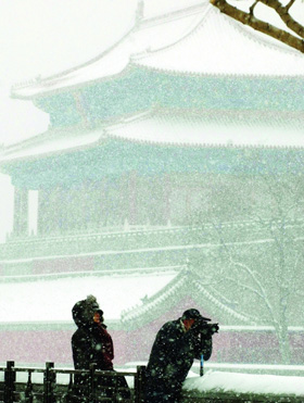 圖為1月3日,一名攝影愛好者在北京故宮外拍攝雪景。 |