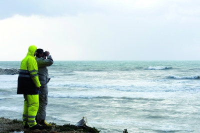 1月25日,在黎巴嫩首都貝魯特南部海岸,救援人員用望遠鏡查看客機墜毀現(xiàn)場。一架埃塞俄比亞客機當日從黎巴嫩首都貝魯特機場起飛后不久墜入地中海,失事客機上載有83名乘客和7名機組人員。