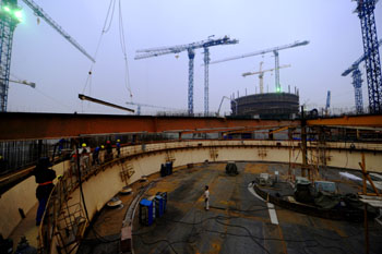 建設(shè)中的紅沿河核電站4號機組核島。作為中國東北第一座核電站——遼寧紅沿河核電站一期工程正式開工兩年多來,建設(shè)速度與質(zhì)量均衡推進,主要設(shè)備的國產(chǎn)化配套與技術(shù)創(chuàng)新等都取得了重要進展。新華社記者 任勇/攝 |