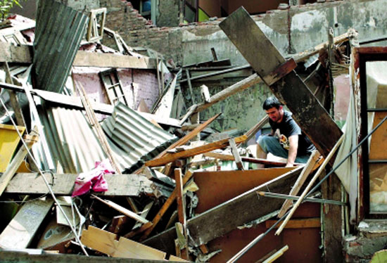 2月27日,在智利首都圣地亞哥,一名男子在廢墟內(nèi)尋找可能利用的物品。