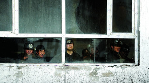 3月1日,幾名礦工在救援現(xiàn)場(chǎng)等待參加救援。