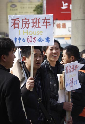 3月18日,參展房地產(chǎn)企業(yè)的工作人員在廣場上招攬看房者。 當(dāng)日,有“上海樓市風(fēng)向標(biāo)”之稱的“2010上海之春房產(chǎn)展示交易會”在上海展覽中心開幕。此次參展的國內(nèi)開發(fā)商約200家,展覽面積達2萬平方米。在2009年底以來推出的密集調(diào)控政策影響下,本屆展會首日盡管人氣不減,但市場的觀望氣氛也悄然升溫。