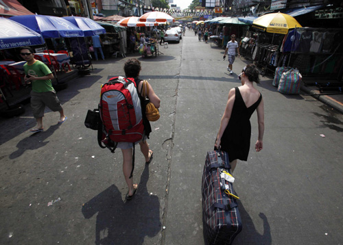 3月18日,在泰國首都曼谷,兩名外國游客帶著行李穿過一條購物街。 泰國酒店協(xié)會(huì)會(huì)長薩林·初薩威18日說,受民間政治團(tuán)體反獨(dú)裁民主聯(lián)盟(反獨(dú)聯(lián))的支持者“紅衫軍”集會(huì)影響,泰國首都曼谷的酒店每天約有1000間客房被取消,游客數(shù)量下降了10%到20%。