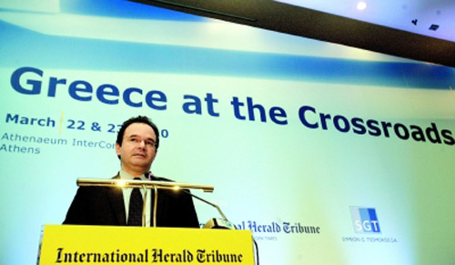 3月23日,希臘財(cái)政部長(zhǎng)喬治·帕帕康斯坦季努在雅典舉行的“希臘在十字路口上”經(jīng)濟(jì)研討會(huì)上發(fā)言。帕帕康斯坦季努表示,希臘尋求并期待25日的歐盟首腦會(huì)議出臺(tái)針對(duì)希臘債務(wù)危機(jī)的救助方案,但這絕非乞求。新華社發(fā)