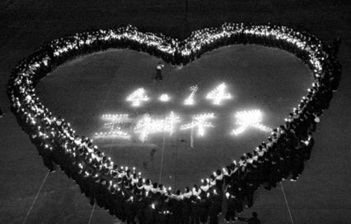 4月19日,江蘇省徐州市睢寧縣文華中學(xué)的師生在校園內(nèi)點(diǎn)燃蠟燭,組成“4·14”“玉樹不哭”字樣,為青海玉樹地震災(zāi)區(qū)群眾送去祝福。新華社發(fā) |
