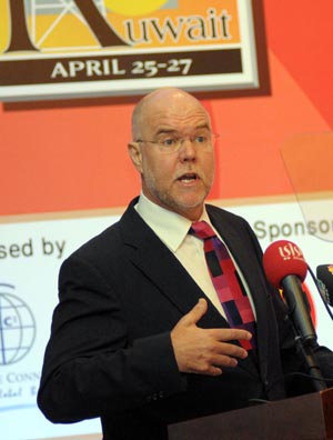 4月26日,在科威特首都科威特城,殼牌集團(tuán)執(zhí)行董事兼勘探開(kāi)發(fā)總裁馬博德在第18屆中東石油和天然氣大會(huì)開(kāi)幕式上致辭。來(lái)自中東油氣資源出口國(guó)和跨國(guó)石油公司的550多名代表與會(huì)討論石化工業(yè)發(fā)展和清潔能源等議題。今年會(huì)議主題為“石油需求復(fù)蘇與價(jià)格波動(dòng)”。