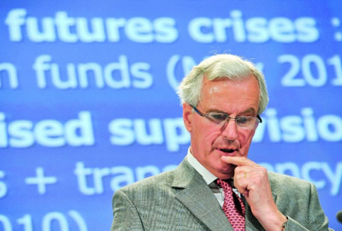 5月17日,在比利時(shí)首都布魯塞爾,歐盟委員會(huì)負(fù)責(zé)內(nèi)部市場(chǎng)與服務(wù)的委員巴尼耶就金融監(jiān)管改革舉行新聞發(fā)布會(huì)。