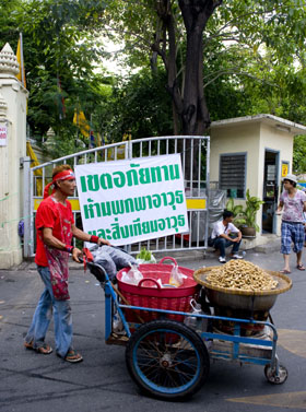 18日,在泰國首都曼谷的一座寺廟前,一名小販等待顧客。據(jù)泰國一家研究機(jī)構(gòu)估測,泰國軍隊(duì)與“紅衫軍”沖突至今已經(jīng)造成530億至2300億泰銖(約合15.9億至69億美元)的經(jīng)濟(jì)損失。