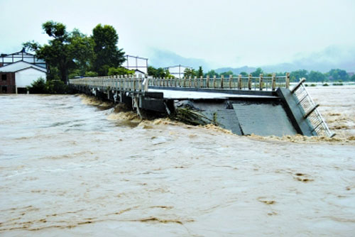 206國道江西鷹潭境內(nèi)龍虎山魚塘大橋被洪水沖垮,交通中斷(6月20日攝)。 近日,受持續(xù)強降雨影響,江西省鷹潭市境內(nèi)的鐵路、高速公路和國道全面中斷。目前,當?shù)赜嘘P(guān)部門正組織力量全面搶修水毀交通設(shè)施。新華社發(fā)