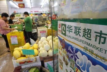 6月28日,市民在上海徐匯區(qū)的一家華聯(lián)超市內(nèi)選購商品。近日,上海兩大超市品牌“聯(lián)華超市”和“華聯(lián)超市”完成重組整合,躍居中國最大的連鎖標準化超市企業(yè)。聯(lián)華、華聯(lián)將于今年7月10日起合署辦公。據(jù)介紹,整合后新聯(lián)華門店規(guī)模將突破3500家,銷售規(guī)模近500億元。