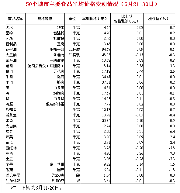 7月5日,國家統(tǒng)計局在其官網(wǎng)上公布“50個城市主要食品平均價格變動情況(6月21-30日)”顯示,豬肉價格明顯反彈。其中,豬肉后臀尖(后腿肉)每千克18.14元,比6月中旬(下同)上漲3.3%,五花肉每千克17.18元,上漲2.6%。其他肉類價格基本持平,漲跌幅均在1%以內(nèi)。 蔬菜價格漲跌互現(xiàn)。油菜、芹菜分別上漲6.4%和2.4%。黃瓜、西紅柿、豆角、土豆價格明顯下跌,跌幅分別為2.4%、5.8%、7.0%和7.3%。