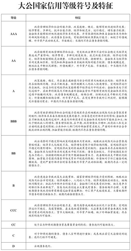 根據(jù)確定的影響國家信用風(fēng)險五大關(guān)鍵評級要素及能夠刻畫這些要素的具體指標(biāo),大公建立了國家信用評級操作系統(tǒng)。錄入指標(biāo)數(shù)據(jù),依據(jù)設(shè)定的評分方法和評分標(biāo)準(zhǔn),系統(tǒng)會產(chǎn)生初始信用等級,之后經(jīng)過信用評審委員會的調(diào)整形成最終的本、外幣國家信用等級。其具體思路和步驟如下: 第一步,分別確定國家管理能力、經(jīng)濟(jì)實力、金融實力、財政實力及外匯實力的信用分值。 以國家管理能力為例,首先對其中的各項指標(biāo)進(jìn)行模型量化處理,接下來將得分加權(quán)平均,得到一國國家管理能力的最初得分,之后評審會會綜合考慮在模型中沒有體現(xiàn)的該國在國家管理能力方面的特有優(yōu)勢或劣勢,并通過國家間的比較,對初始得分進(jìn)行一定調(diào)整,最后得到該國家的最終得分。分值區(qū)間從0到9,0分代表風(fēng)險最高,9分代表風(fēng)險最低。 第二步,對前四大要素進(jìn)行加權(quán)平均,得到本幣信用分值,并將分值對應(yīng)為信用等級。 大公國家信用等級從高到底,從AAA到D共十個等級。除“AAA”、“C”和“D”等級外,每個信用等級可用“+”或“-”進(jìn)行微調(diào),分別表示比相應(yīng)等級的信用質(zhì)量稍高或稍低。 第三步,綜合外匯實力得分,對本幣信用等級進(jìn)行調(diào)整,得到外幣信用等級。 外匯實力很強(qiáng)的國家,外幣信用等級有可能超過本幣信用等級,但在多數(shù)情況下,外幣信用等級會等于或低于本幣信用等級。 這樣,最終得到了本幣和外幣的國家信用等級。下面列出大公國家信用等級符號及相應(yīng)等級的信用風(fēng)險特征。應(yīng)強(qiáng)調(diào)的是,被評定為某一信用等級的國家,并非必須滿足該信用等級相對應(yīng)的所有特征,但一般應(yīng)滿足其中多項特征。