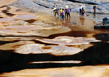 7月13日,工人在清理發(fā)生滲漏的紫金礦業(yè)銅礦濕法廠污水池內(nèi)剩余的污水。新華社記者 姜克紅