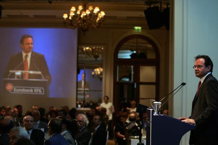 7月19日,希臘財(cái)長帕帕康斯坦季努在雅典出席希臘歐元銀行組織召開的研討會(huì)。 帕帕康斯坦季努當(dāng)天在研討會(huì)上表示,希臘銀行經(jīng)得起歐盟專家提出的考驗(yàn),希臘最終能戰(zhàn)勝危機(jī)。