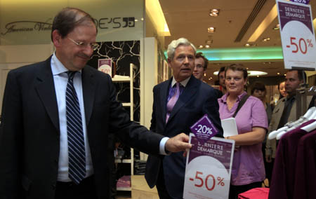 8月3日,法國負責貿(mào)易和旅游事務的國務秘書埃爾韋·諾韋利(左)在法國巴黎的老佛爺百貨商店參觀。 經(jīng)過長達5個星期的“熱鬧”,法國大部分地區(qū)2010年夏季打折季于3日落下帷幕。埃爾韋·諾韋利預測說,今夏打折季的營業(yè)額將至少同比增長5%,而一些行業(yè)協(xié)會對此表現(xiàn)出謹慎態(tài)度。