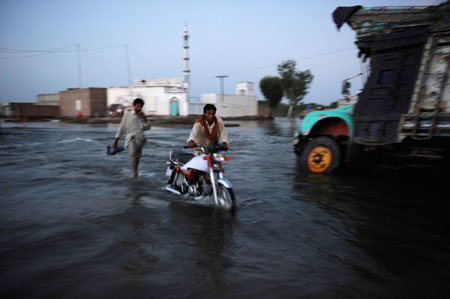 8月21日,在巴基斯坦穆扎法爾格爾附近的一個(gè)村莊,一名男子推著摩托車涉水前行。 國(guó)際貨幣基金組織(IMF)當(dāng)天宣布,將在下周與巴基斯坦政府官員在華盛頓舉行會(huì)議,討論特大洪災(zāi)對(duì)巴基斯坦經(jīng)濟(jì)造成的影響及該組織可能采取的援助計(jì)劃。