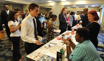 7月19日,在美國洛杉磯,人們在一次招聘會上尋找工作機會。新華社/法新 |