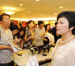 8月24日,康泰旅行社總經(jīng)理劉美詩(shī)(右)出席記者會(huì)。 當(dāng)日中午,香港康泰旅行社召開記者會(huì)介紹,受菲律賓人質(zhì)劫持事件影響的香港旅行團(tuán)成員大部分通過(guò)旅行社購(gòu)買了保險(xiǎn),保險(xiǎn)公司將按照特殊情況處理,對(duì)每名遇害者按照最高額度100萬(wàn)港元進(jìn)行理賠,傷者醫(yī)療費(fèi)用最高也可至100萬(wàn)港元。新華社發(fā)