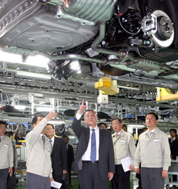 現(xiàn)代汽車總裁鄭夢(mèng)九在視察現(xiàn)代汽車廠的生產(chǎn)車間