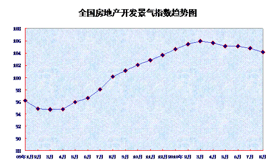 8月份,全國房地產(chǎn)開發(fā)景氣指數(shù)(簡(jiǎn)稱“國房景氣指數(shù)”)為104.11,比7月份回落0.60點(diǎn),比去年同期提高4.03點(diǎn)。
