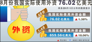 據(jù)商務(wù)部公布,2010年1至8月,全國新批設(shè)立外商投資企業(yè)16721家,同比增長18.33%,實(shí)際使用外資金額659.56億美元,同比增長18.06%!督(jīng)濟(jì)參考報(bào)》記者注意到,從今年3月以來,我國吸收外資金額一直保持著兩位數(shù)的高速增長,8月同比增長1.38%為近6個(gè)月來的最低增幅,僅稍高于存在春節(jié)因素的2月。
