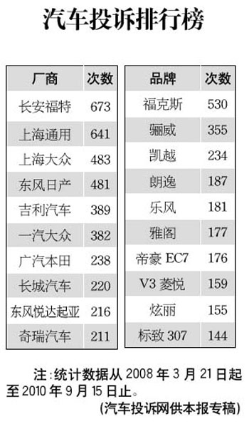 汽車投訴排行榜公布 長(zhǎng)安福特高居榜首