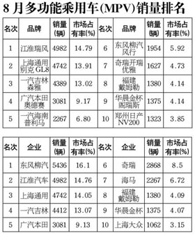 8月多功能乘用車(MPV)銷售3.38萬輛,環(huán)比增長8.72%,同比增長67.04%;MPV市場的高增長雖然沒有SUV那么搶眼,但依然處在近年來的高增長期。