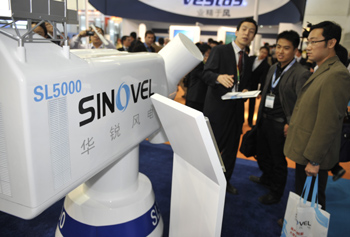 10月13日,工作人員在2010北京國際風(fēng)能大會(huì)暨展覽會(huì)上向參觀者介紹華銳風(fēng)電的5兆瓦風(fēng)電機(jī)組模型。本報(bào)記者 魯鵬/攝 |