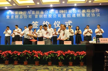 吉林省副省長王祖繼代表省政府與首鋼總公司董事長朱繼民、首鋼控股公司總裁李志強共同簽訂了《戰(zhàn)略合作框架協(xié)議》。首鋼總公司、首鋼控股公司、吉林省國資委、吉林省建通投資公司、通鋼集團負責人共同簽署了《通鋼集團重組協(xié)議》。通化市政府與首鋼控股公司簽訂了《戰(zhàn)略合作框架協(xié)議》。