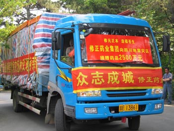 2008年5月15日,吉林修正藥業(yè)向四川地震災(zāi)區(qū)捐贈(zèng)的價(jià)值2500萬(wàn)元的藥品,將通過(guò)吉林紅十字會(huì)運(yùn)往四川。資料照片 |