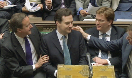 圖為英國(guó)財(cái)政大臣喬治·奧斯本(左二)20日在議會(huì)公布政府削減財(cái)政預(yù)算方案之后的情形,左一為英國(guó)首相戴維·卡梅倫。根據(jù)該方案,英國(guó)政府將在未來(lái)幾年削減830億英鎊的財(cái)政預(yù)算,其中社會(huì)福利開(kāi)支將減少70億英鎊,英國(guó)人的退休年齡到2020年也將升至66歲。英國(guó)官方數(shù)據(jù)顯示,政府上一財(cái)年的財(cái)政赤字為1454億英鎊,創(chuàng)二戰(zhàn)以來(lái)的最高紀(jì)錄。