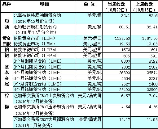 當(dāng)周國(guó)際大宗商品價(jià)格全線回落,周中受中國(guó)意外加息影響,市場(chǎng)擔(dān)心需求減少,各品種期貨價(jià)格暴跌,截至周末跌幅收窄。不過,由于大多數(shù)投資者預(yù)期美聯(lián)儲(chǔ)將采取定量寬松的政策刺激美國(guó)經(jīng)濟(jì)復(fù)蘇,大宗價(jià)格仍將在一段時(shí)間獲得支撐。